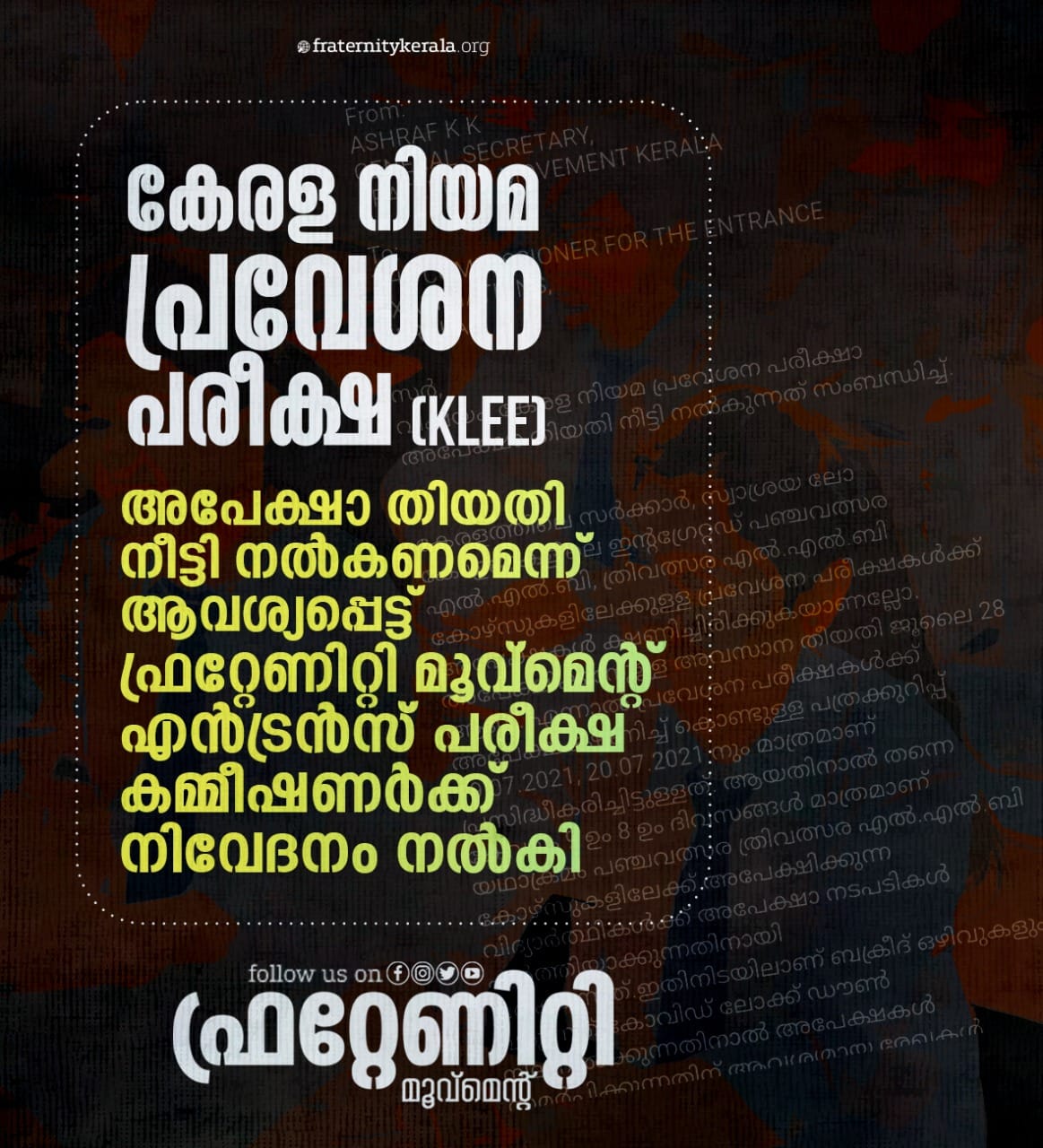 കേരളത്തിലെ സർക്കാർ, സ്വാശ്രയ ലോ കോളജുകളിലെ ഇന്റഗ്രേറ്റഡ് പഞ്ചവത്സര എൽ.എൽ.ബി, ത്രിവത്സര എൽ.എൽ.ബി കോഴ്സുകളിലേക്കുള്ള പ്രവേശന പരീക്ഷക്കുള്ള അപേക്ഷ സമർപ്പിക്കാനുള്ള തിയതി നീട്ടണമെന്ന് ആവശ്യപ്പെട്ട് ഫ്രറ്റേണിറ്റി മൂവ്മെന്റ് എൻട്രൻസ് പരീക്ഷാ കമ്മീഷണർക്ക് നിവേദനം നൽകി. ഫ്രറ്റേണിറ്റി മൂവ്മെന്റ് കേരള സംസ്ഥാന ജനറൽ സെക്രട്ടറി അഷ്റഫ് കെ.കെയാണ് നിവേദനം നൽകിയത്.