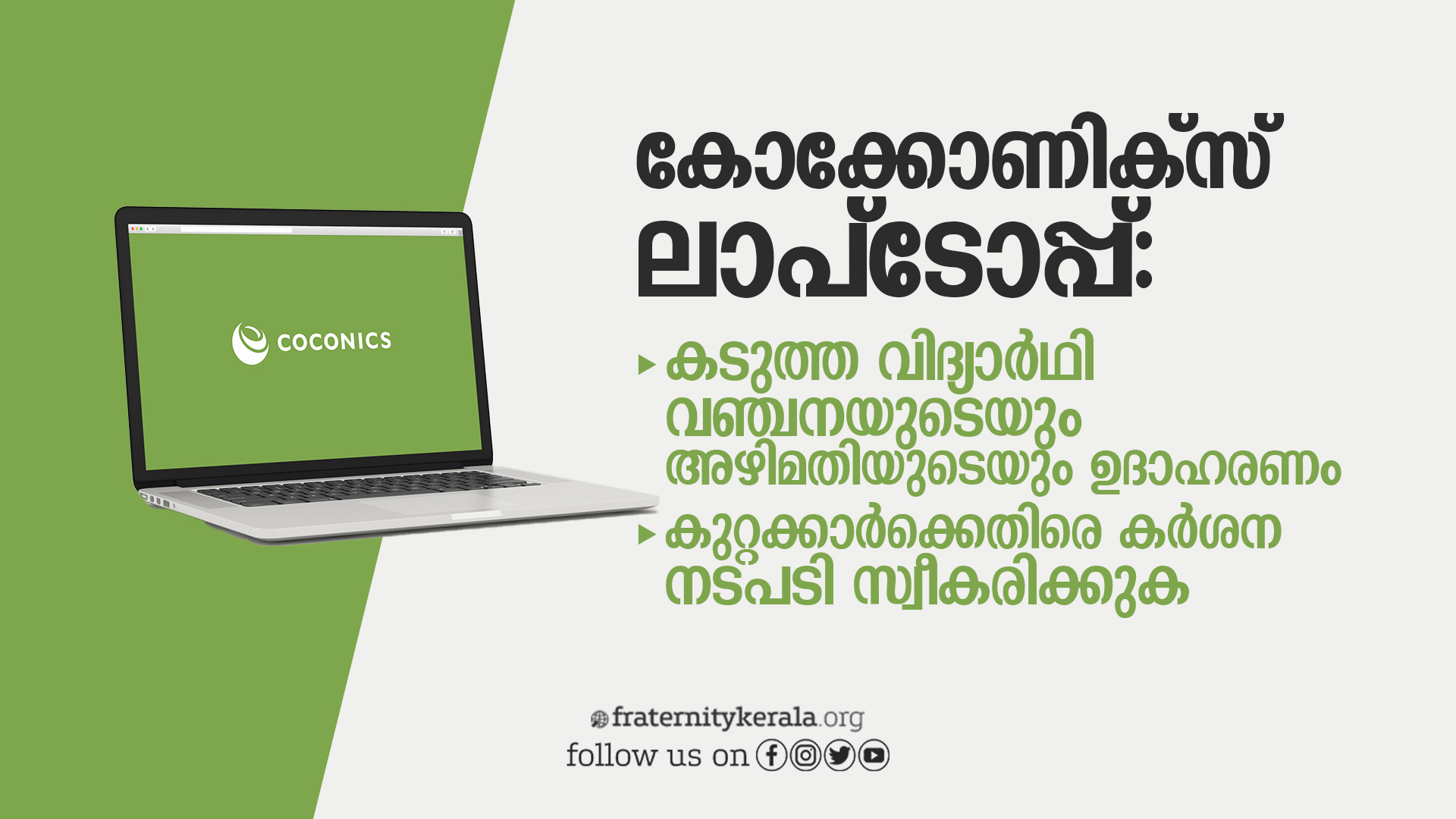 എസ്.സി, എസ്.ടി വിദ്യാര്ത്ഥികള്ക്ക് വിതരണം ചെയ്യാന് തീരുമാനിച്ച ലാപ്ടോപ്പുകളില് ഒന്നായിരുന്നു കൊക്കോണിക്സ് ലാപ്ടോപ്പ് എന്നത് കെടുകാര്യസ്ഥതയുടെയും അഴിമതിയുടെയും ഗൗരവം വര്ധിപ്പിക്കുന്നതാണെന്നും ഫ്രറ്റേണിറ്റി മൂവ്മെന്റ് പത്രക്കുറിപ്പില് അറിയിച്ചു.