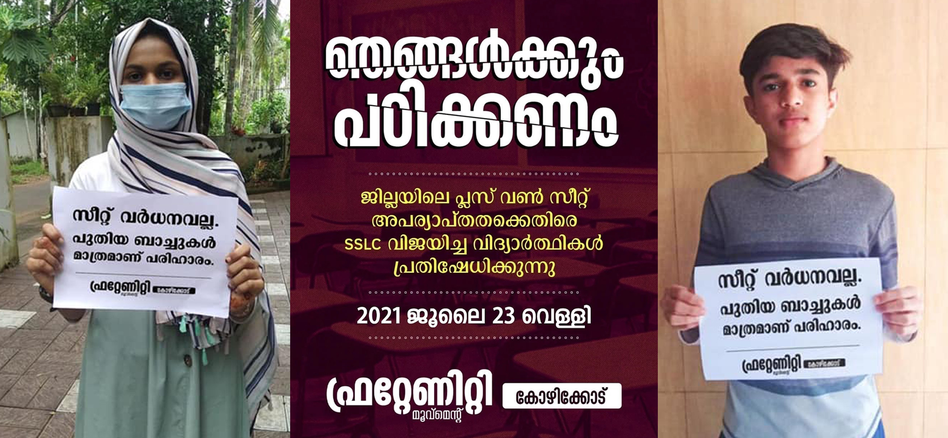 പ്ലസ് വൺ സീറ്റുകളിലെ അപര്യാപ്തത ഉടൻ പരിഹരിക്കുക, മുഴുവൻ വിദ്യാർത്ഥികൾക്കും ഹയർസെക്കന്ററി പഠനത്തിനു അവസരം ഒരുക്കുക എന്നീ ആവശ്യങ്ങൾ ഉന്നയിച്ചു കൊണ്ടാണ് ഫ്രറ്റേണിറ്റി എസ്. എസ്. എൽ. സി വിദ്യാർത്ഥികളുടെ പ്രതിഷേധം സംഘടിപ്പിച്ചത്. ജില്ലയിലെ നൂറുകണക്കിന് വിദ്യാർത്ഥികൾ വീടുകളിൽ നിന്ന് പ്രതിഷേധത്തിൽ പങ്ക് ചേർന്നു.