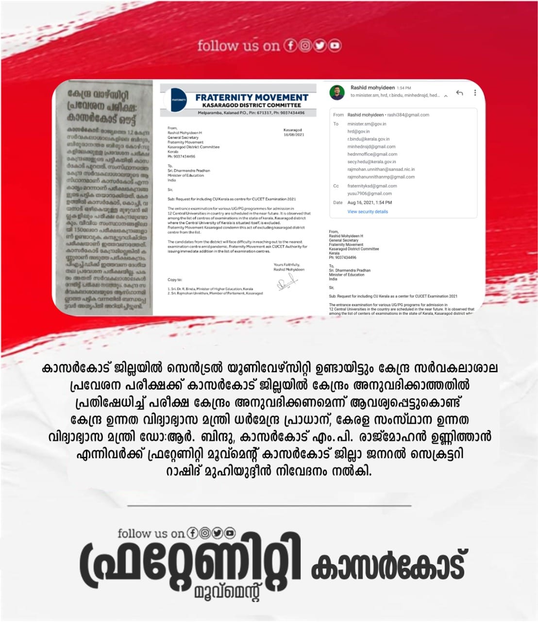 കാസർകോട്: കാസർകോട് ജില്ലയിൽ സെൻട്രൽ യൂണിവേഴ്സിറ്റി ഉണ്ടായിട്ടും കേന്ദ്ര സർവകലാശാല പ്രവേശന പരീക്ഷക്ക് കാസർകോട് ജില്ലയിൽ കേന്ദ്രം അനുവദിക്കാത്തത് പ്രതിഷേധാർഹമാണ്. കേരളത്തിലെ മറ്റു 10 ഇടങ്ങളിൽ പരീക്ഷാ കേന്ദ്രം ഉണ്ടായിരിക്കെ കാസർകോട് ജില്ലയിലെ വിദ്യാർഥികൾ ഈ കോവിഡ് സാഹചര്യത്തിലും മറ്റു ജില്ലകളെ ആശ്രയിക്കേണ്ടി വരും. കാസർകോട് ജില്ലയിൽ കേന്ദ്ര സർവകലാശാല പ്രവേശന പരീക്ഷക്ക് കാസർകോട് ജില്ലയിൽ കേന്ദ്രം അനുവദിക്കണമെന്ന് ആവശ്യപ്പെട്ടുകൊണ്ട് കേന്ദ്ര ഉന്നത വിദ്യാഭ്യാസ മന്ത്രി ധർമേന്ദ്ര പ്രാധാന്, കേരള സംസ്ഥാന ഉന്നത വിദ്യാഭ്യാസ മന്ത്രി ഡോ:ആർ. ബിന്ദു, കാസർകോട് എം.പി. രാജ്മോഹൻ ഉണ്ണിത്താൻ എന്നിവർക്ക് ഫ്രറ്റേണിറ്റി മൂവ്മെന്റ് കാസർകോട് ജില്ലാ ജനറൽ സെക്രട്ടറി റാഷിദ് മുഹിയുദ്ദീൻ നിവേദനം നൽകി.