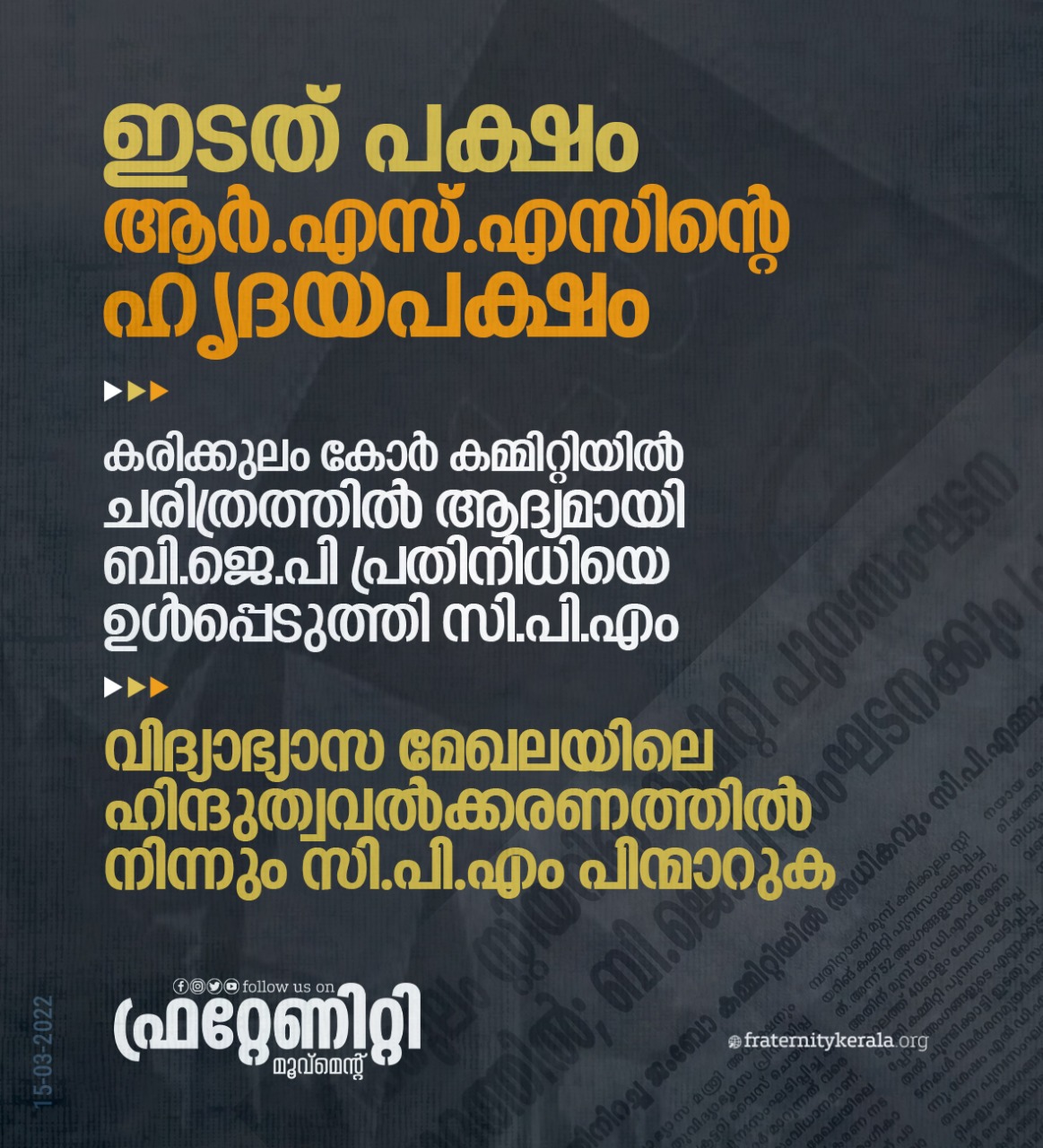 ഇടതു പാർട്ടിക്കാരെയും കുത്തിനിറച്ച് പുനഃസംഘടിപ്പിച്ചത്. ഹയർസെക്കൻഡറി മേഖലയുമായി ബന്ധപ്പെട്ട അക്കാദമിക വിഷയങ്ങളും പാഠപുസ്തകങ്ങളുടെ അംഗീകാരം ഉൾപ്പെടെ കാര്യങ്ങളും തീരുമാനിക്കുന്ന കരിക്കുലം സ്റ്റിയറിങ് കമ്മിറ്റിയിലൂടെ വിദ്യാഭ്യാസ മേഖലയിൽ ഹിന്ദുത്വ അജണ്ട നടപ്പിലാക്കാൻ ശ്രമിക്കുന്ന ഇടതു പക്ഷ സർക്കാരിൻ്റെ കാപട്യത്തെ ശക്തമായി ചോദ്യം ചെയ്യുമെന്നും ഫ്രറ്റേണിറ്റി മൂവ്മെൻ്റ് സംസ്ഥാന സെക്രട്ടേറിയറ്റ് കൂട്ടി ചേർത്തു.